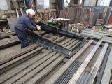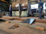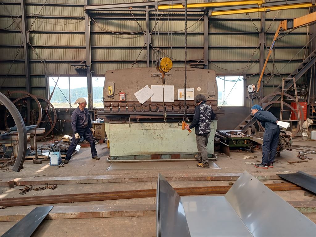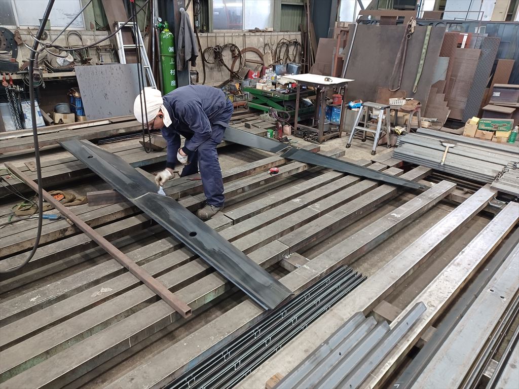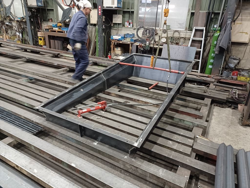 正立姿勢に戻してから上部フランジの歪修正をしている。 |