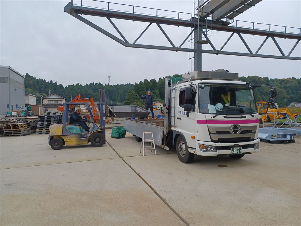 四トン車はクレーン下にいるが、持ち替えせずにフォークリフトでそのまま積み込み。 |