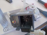 振動する器械なので、モーターはスポンジや防振ゴムを介して両面テープやら接着剤やらでくっつけてあった。 元に戻らなくてもやむなし、ダメもとで平ドライバーを突っ込んで無理やり引っぺがした。 これでやっとモーターにアクセスできるようになり、まずは吸引部のカバーを開けてみた。 するとモーターを固定しているビスの頭が二つ見えた。 しかしビスを外してもモーターは外れなかった。 |