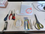 今回お世話になった工具の皆さん。 右端のハサミは両面テープを切るために登場願った。 手前左から二番目の爪楊枝は、モーターカバーの隙間からローターを突っついてみるとき使った。 ドライバーなどを突っ込んで巻線を痛めたら、それこそジ・エンドとなるので。 |