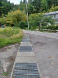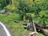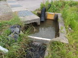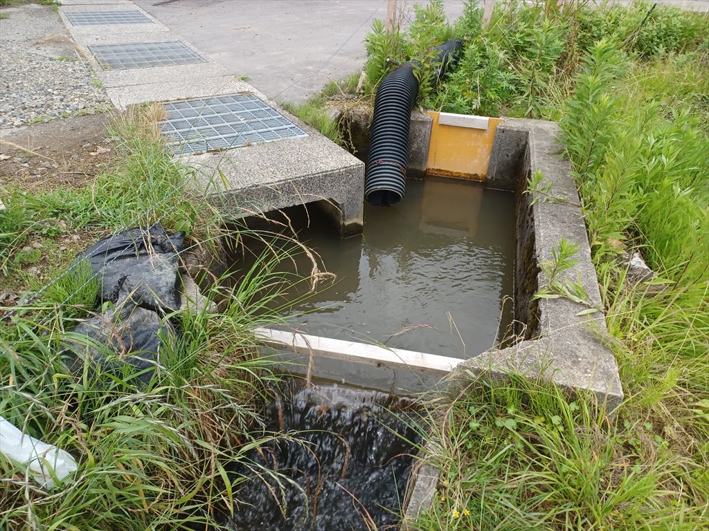 ここが出田平野の給水地点となる。 黒いサクションホースの先からは水が出ていない。 四月末に見て回ったとき、国道を横断して若山川に向かってホースの敷設工事中だったが、行きつく先は川から水を汲む揚水ポンプのはず。 そして左の暗渠からは水が流れ出ていた。 |