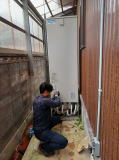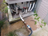 エコキュートの温水配管を外し、電気温水器から来たホースを接続する。 温水配管から電気温水器へ冷水が逆流しないよう、逆止弁も入れておく。 |