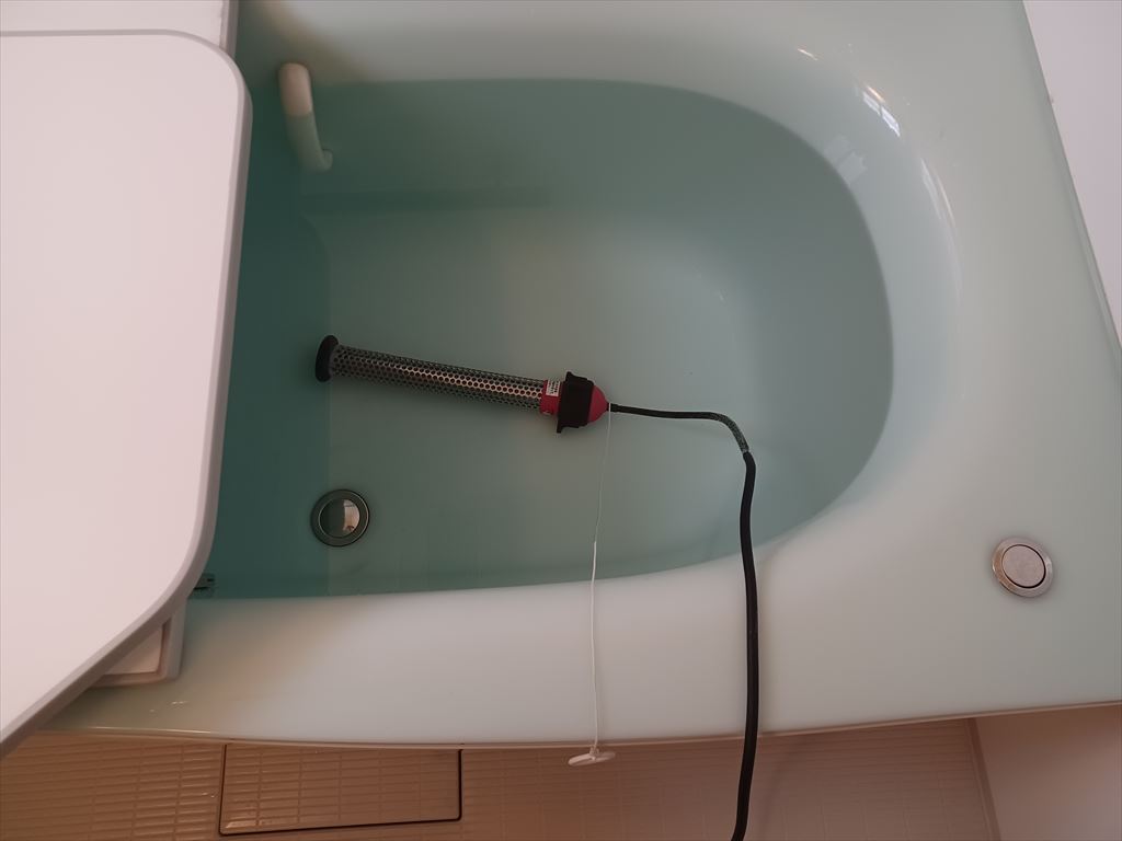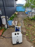 運用方針として、当分の間は湯船には浸からず、水中ポンプ式携帯シャワーを湯船に入れてシャワーだけとする。 この携帯用シャワーは沸かし太郎のあと、さほど間を置かず投入されたもので、本来はシャワーのない風呂で使われるらしい。 12Vの充電式なので感電の恐れはない。 沸かし太郎と違い、断水解消後も風呂で榮ちゃん團ちゃんのおもちゃとして使われ続けている、立派な現役だ。 |