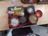 これが噂に名高い巨大エビフライ定食2.000円。 σ(^_^)にはわからないが、今新の有頭エビフライ定食のエビより大きいそうだ。 いつもなら頭から食べるところ、頭は危険だとして残したらしい。 |