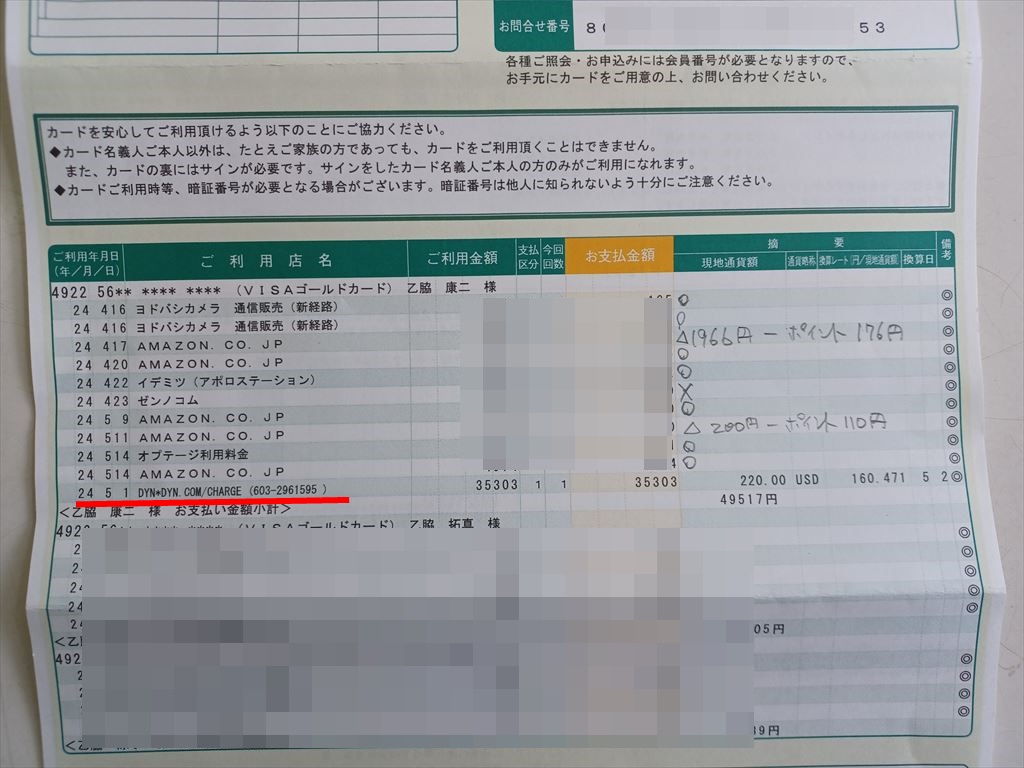 心当たりのない引き落し 天下の悪法、インボイス制度のおかげで、会社のクレカで買い物をすると、各自が領収書を揃えなきゃならなくなった。 領収書発行のやり方は各社様々で、手順はとても覚えられず、メモっておいても毎月一苦労する。 今月も経理から督促があってひと汗掻いたが、一番下の行を見て仰天した。 2024.05.01 DYN*DYN.COM/CHARGE(603-2961595)35,303円 (220ドル×レート160.471円/ドル) 知らね〜。。。まったく身に覚えがない。 北朝鮮あたりにカード情報を盗まれたじゃないか、と一番先に頭に浮かんだ。 とすると、せっかく借り入れた震災対策特別融資が流出してしまう。 お嫁ちゃんに調べてもらうと、どうやら DYN.COM なるサイトは実在はしているようだ。 北朝鮮に資金が流出することはなさそうで、最悪の事態は免れたが、引き落としの理由がわからない。 過去にさかのぼってカード会社の請求書を見てみると、五年前にも同じ220ドル相当の引き落としが見つかった。 それ以前は帳票が保存されておらず不明だが、おそらく10年か15年前ぐらいに、なんらかのヘマをやったようだ。 インボイスが始まる前は、クレカの請求はざっくり消耗品で記帳していたので、明細を見ることなどなかった。 心当たりのない引き落しが見つかったのは、インボイス制度のおかげと言えばおかげだが。。。 このままでは五年おきの引落しを止めることができない。 致命傷ではないにしても、でっかい骨がのどに刺さったままだ。 |