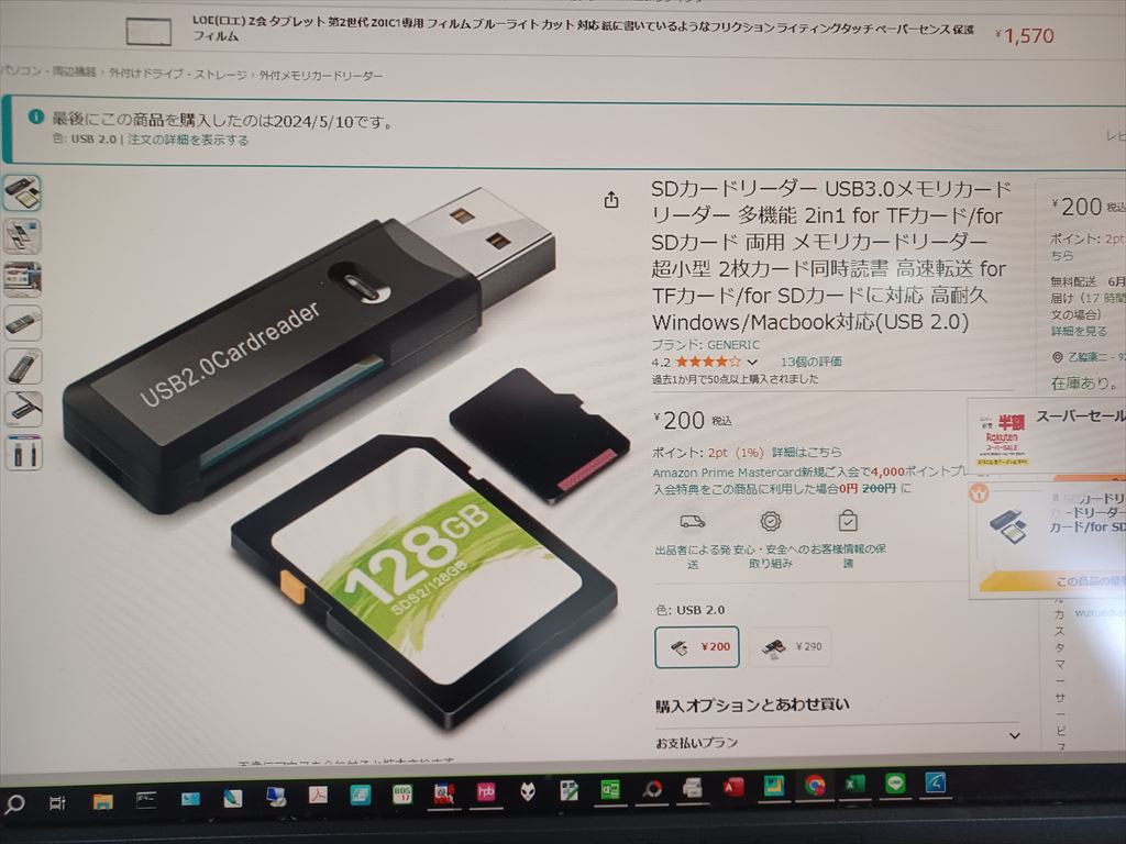 2024.06.05(水) 晴れ時々曇り 24.0℃ P0 U3.1 W64.10%21.1 132-76-58 本日の滞留円筒 計30本(完成品0本 塗装済13+3+7+3本 錆止済0+0+0+0本 未塗装0+0+0+2本 半製品0+0+0+2本) USBメモリー型カードリーダ 先月、常用のカードリーダが壊れ、アマゾンからカードリーダを購入して交換した。 その際、USBメモリー型のカードリーダも不調だったので、めったには使わないが、ついでに注文しておいた。 たかが200円、しかもポイントが110あったので実質90円で買えたが、中華直輸入で納期は半月だそうだ。 どうせ使う予定はないし、忘れた頃には届くだろう。 |