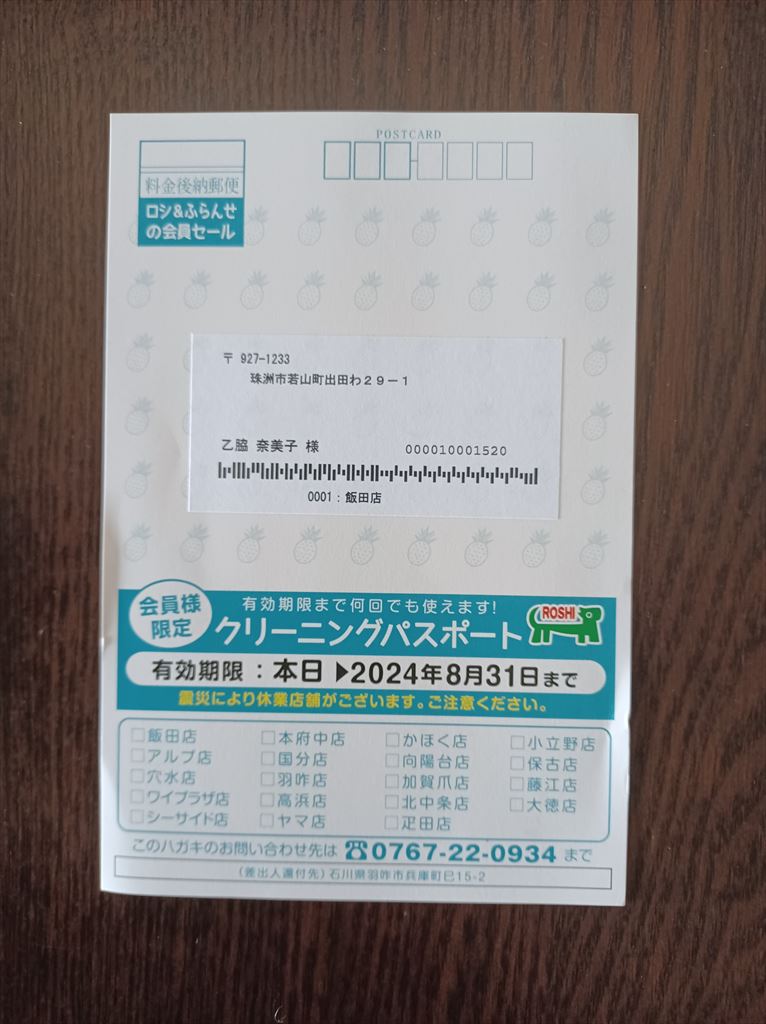 クリーニング屋も息を吹き返したそうで、飯田店から割引のハガキが届いた。 ペンギンは飯田店の受付担当とスーパーで出会って、すでに営業再開を聞いていたそうだ。 ハガキが来たのは冬用の毛布を出してしまったあとだ。 これを出し遅れの証文と言う。 |