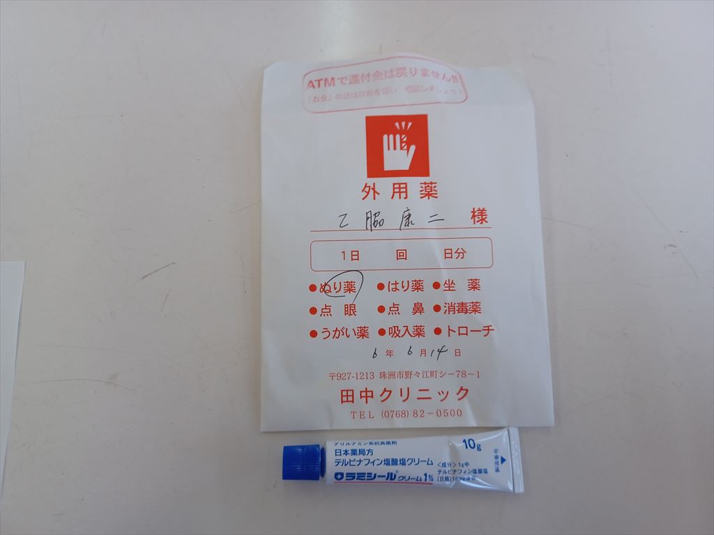 診察はいつも通り超速で、チラッと見ただけの即断即決。 塗り薬を出しておきましょう、と言われ、ラミシール、ルリコン、ニゾラールの御三家のうち、何が出てくるかと思ったら、ラミシールだ。 ラミシール一本で1,100円はちと高いような気もするが、初診だから仕方がない。 薬だけ見れば患者負担分が 70点×3=210円 だから、二回目に三本ほど貰えば元は取れるだろう。 |