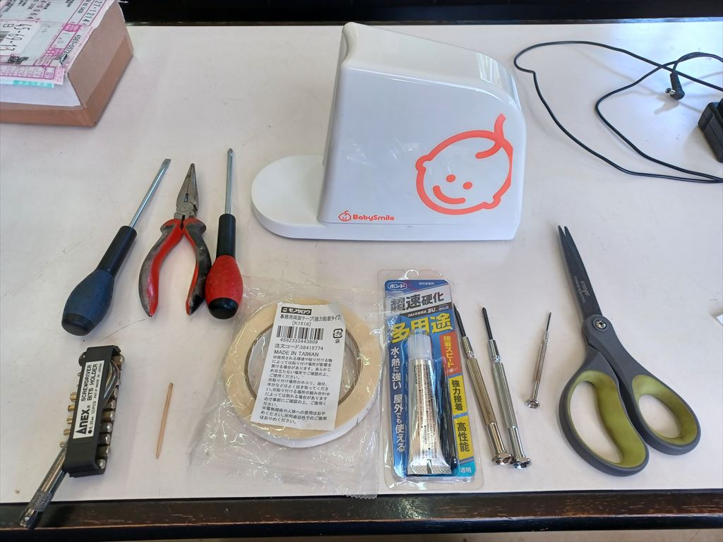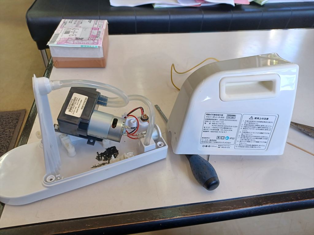 2024.06.17(月) 晴れ 32.3℃ P0 U2.1 W65.25%20.4 124-69-56 本日の滞留円筒 計23本(完成品0+3+3本 塗装済13+0+0本 錆止済0+0+0本 未塗装0+0+4本 半製品0+0+0本) 本日の出荷 島根県津和野町行き 10トン車1台 電動鼻水吸引器修理 榮ちゃんが鼻をク〜ンとできない頃、鼻水を吸い出すために購入した電動鼻水吸引器が故障したらしい。 なんでも榮ちゃんが高いところから落としたそうだ。 潜在意識に積年の恨みがあったのかも知れない。 廃線を見ると、電源外付なので、コネクターとモーターとスイッチだけしかなく、故障しそうなところはない。 念のため、スイッチをバイパスして電圧を掛けてみたが、モーターはピクリとも動かなかった。 落とした衝撃でモーターのローターがどうかなって、回らなくなったんだろう。 となると、モーターを分解する必要がある。 そもそもちょっと落としたくらいで回らなくなるなんて、マブチモーターを使わないからこうなるんだ。 ミニ四駆など、高いところからしょっちゅう落ちるもんだが、落としたら回らなくなったと言う話はついぞ聞いたことがない。 |