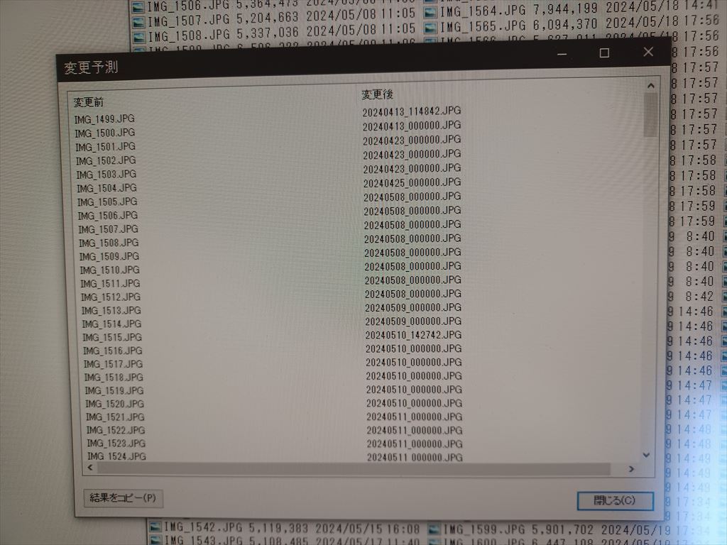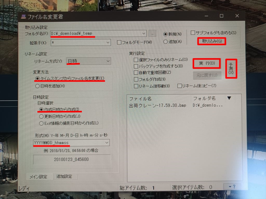 予測ボタンを押してみると・・・ ありゃ。何だこりゃ。 年月日はまともに出るけど、時分秒が 000000 では同じファイル名が続出してしまう。 おそらく実行したらエラーで止まってしまうだろう。 |