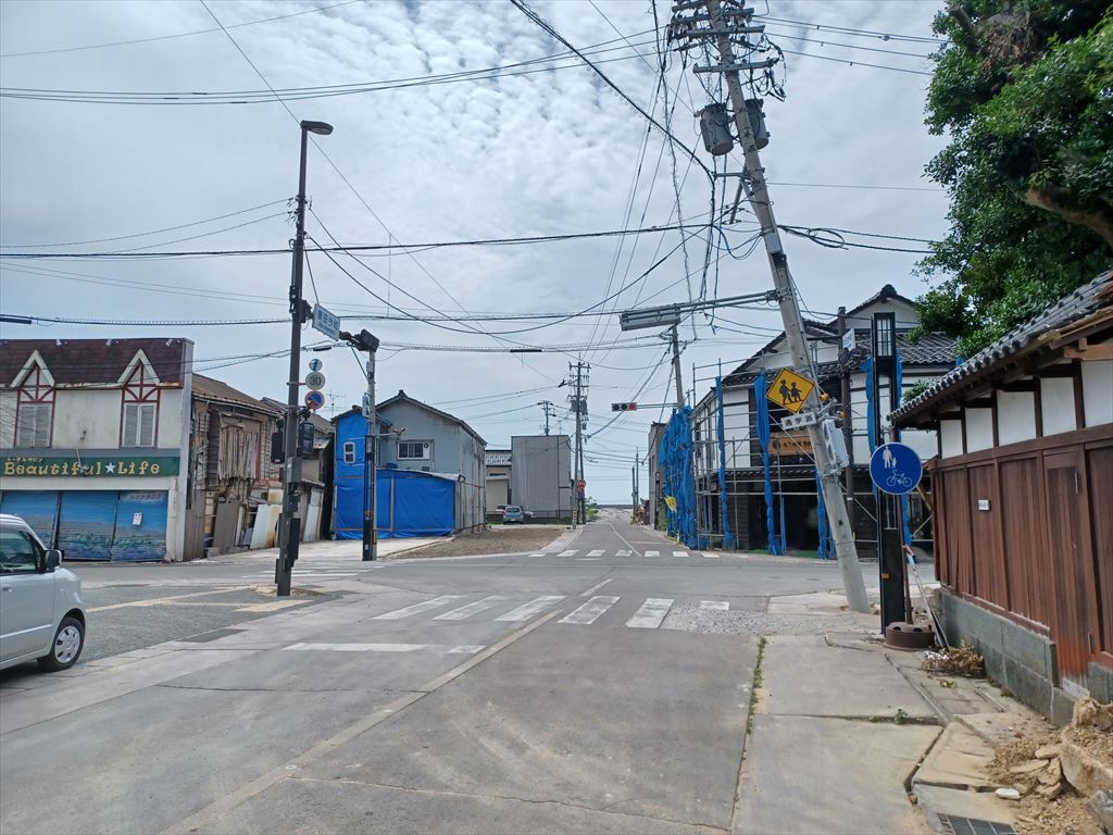 2024.06.22(土) 曇り一時晴れ 26.2℃ P0 U5.1 W64.95%20.2 114-65-54 本日の滞留円筒 計19本(完成品0+3本 塗装済13+0本 錆止済0+0本 未塗装0+2本 半製品0+0+1本) 今日の飯田町交差点 明日は先週と同じ、雨になるらしい。 一週間経って、ザ・飯田町交差点界隈がどの程度片付いたのか、雨が降る前に見て来た。 大町から桟橋を見ると、旧大丸商店跡地はきれいに片付いている。 その右手、南町の海側の角地にある信七の店は、昨年末から足場が建っていた。 改築工事の途中で被災し、進退窮まっているのかも知れんなぁ。。。 手前右、大町と南町の角地にある刀祢さんの屋敷は、解体工事の目隠しのためだろう、真新しく見える板塀だけ残してある。 |