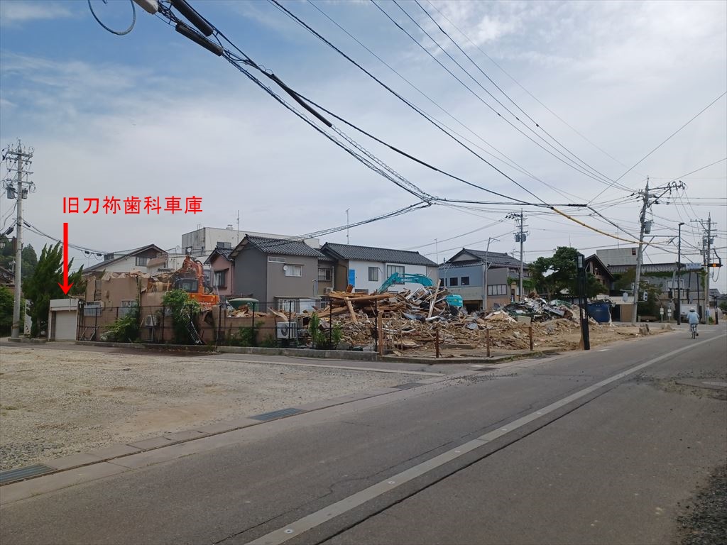 視点を変えて、交差点より南町にだいぶ入り込んだところから旧刀祢歯科方向を見ると、未だかって見たことのない風景が見える。 左手前の空き地は、引っ越した北陸銀行珠洲支店の旧店舗が建っていたところ。 写真の左端、シャッターが下りているのは旧刀祢歯科の車庫で、設計施工はσ(^_^)。 どう頑張ってもペンギンが通勤で使っていた、今は亡きトヨタ・パプリカがギリギリ入るサイズで、現在では軽四しか入らないだろう。 ペンギンが退職したあとは自転車置き場か、物干しぐらいにしか使われていなかったのではなかろうか。 |