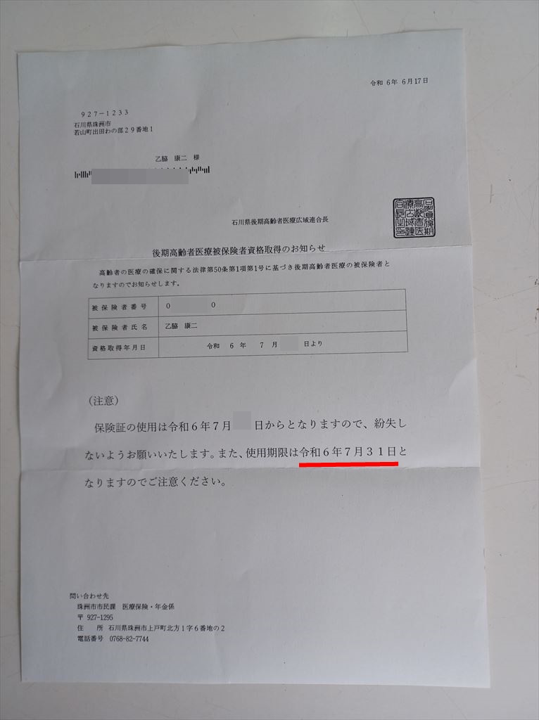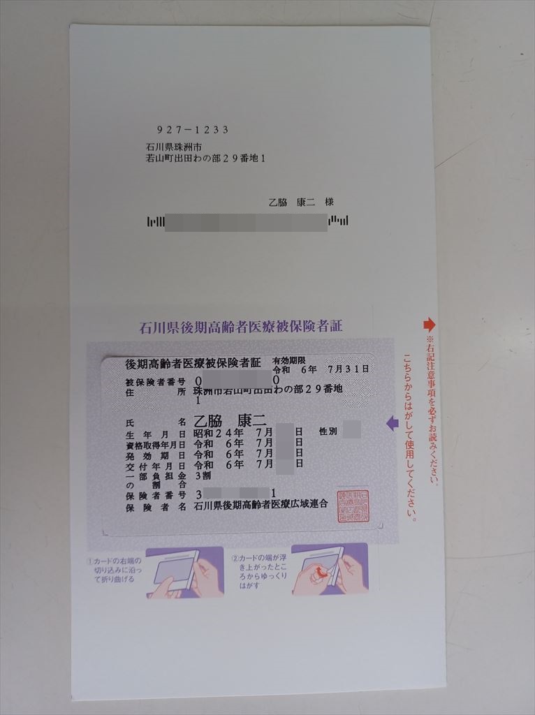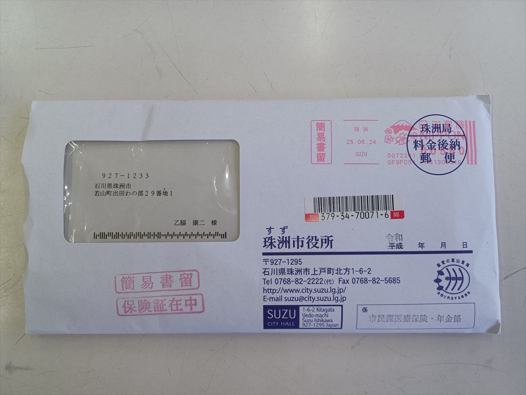 2024.06.27(木) 晴れ 27.8℃ P0 U0.1 W64.60%20.1 123-72-53 本日の滞留円筒 計19本(完成品0+2本 塗装済13+0本 錆止済0+0本 未塗装0+0本 半製品0+0+4本) 本日の出荷 石川県輪島市行き 10トン車3台 後期高齢者医療被保険者証 市役所から分厚い封筒で簡易書留郵便が届いた。 保険証在中とあるが、変だな、σ(^_^)は国民健保ではなく、協会けんぽなんだが? |
