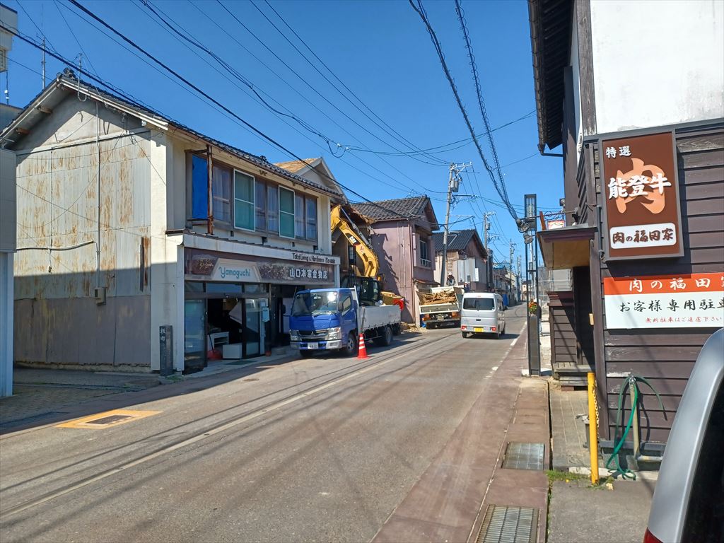 視線を右に向けると、刀祢さんの家が解体中だ。 先代当主は歯科医院を開業しており、ペンギンは姉が歯科医院を開業するまでお世話になっていた。 解体現場を是非とも見ておきたいと言うので連れて来たのに、雨がひどくなってきたら車から降りてこなかった。(-_-;) 刀祢さんと八木さんは古くから珠洲市で覇を競った大地主だ。 今度の地震でどちらの本丸も更地になるとは、盛者必衰の理(ことわり)を感じざるを得ない。 |
