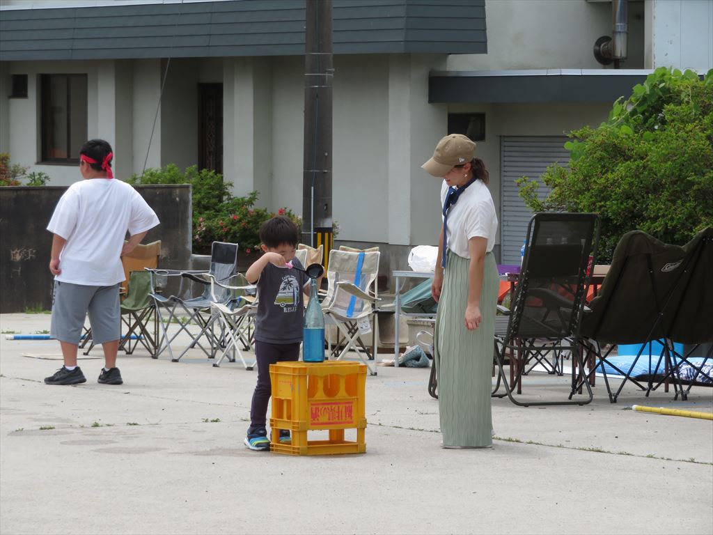 両親とも参加するので、兄弟姉妹がいれば全員参加の一家総出となる。 水入れ競技には團ちゃんも参戦したが、意味が解っていないので敵チームのビンに入れようとしていた。 たぶん榮ちゃんと同じビンに入れたかったんだろう。 |