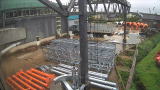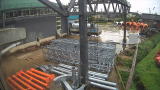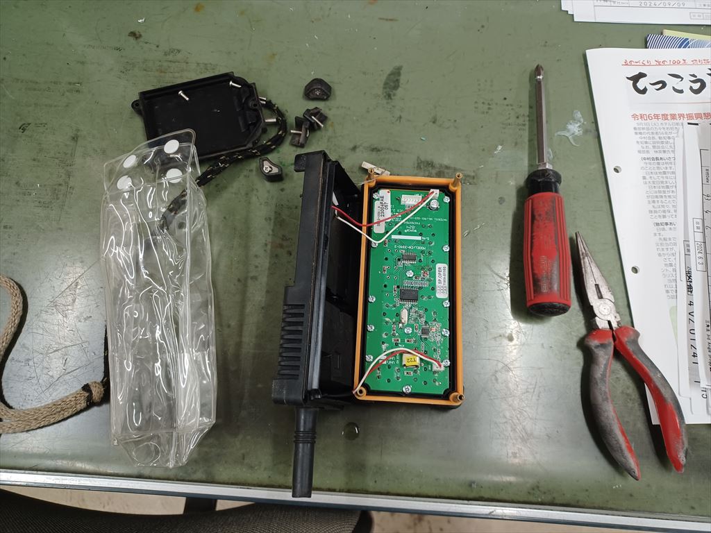 積込も終盤に来て、心配していたクレーンの調子がおかしくなった。 降り続ける雨がリモコン内部に侵入したらしい。 乾かしている暇はないので、かねて準備の予備リモコンと交換して事なきを得た。 |