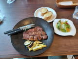 ペンギンはいつものように値段かまわずの裏メニューでサイコロステーキを頼んだ。 サイコロステーキの材料はヒレ肉で、筋はないが脂身もない。 σ(^_^)は多少脂っこいほうが好きなので、上サーロインステーキ1,980円の網焼ではない、敢えてフライパン焼きだ。 サイコロステーキはメニューにないので毎度値段がわからないが、三千ナンボになりますが、と念を押されていた。 |