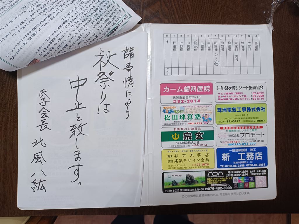 2024.10.05(土) 曇り時々晴れ 22.2℃ P0 U2.2 W65.60%21.6 122-71-53 本日の滞留円筒 計24本(完成品2+7+11本 塗装済0+0+0本 錆止済0+0+0本 未塗装0+0+0+1本 半製品0+0+0+3本) 秋祭り中止 回覧板の一番後ろに、氏子会長名で秋祭りを中止する旨のお知らせが挟んであった。 神社の行事で一番重要な秋祭りだが、氏子会が機能していない今、たとえ氏子会長の独断であっても、文句は出ないだろう。 元旦大地震のあとに線状降水帯の被害まで食らったのだから、誰が考えても秋祭りなどできるはずがない。 ところで、氏神様の白山神社はどうなっているんだろう。 地震以来、お宮さんを見ていないのだが、拝殿や本殿が無事だろうか。 ソロっと見に行くことにした。 |