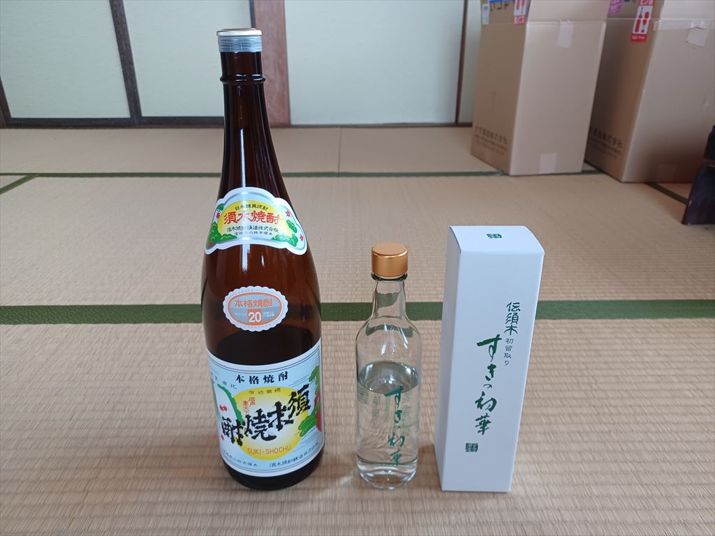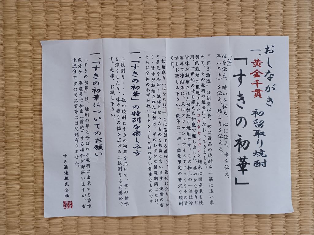 2024.10.06(日) 曇り時々晴れ 21.8℃ P0 U2.0 W65.75%21.7 118-67-53 休み 焼酎で焼酎を割る 寝酒の焼酎が残り一本になったので、いつものように酒造元に須木白六本入り一箱を注文してもらった。 箱を開けてみると、いつものようにおまけの漬物が入っていたが、小さな白い箱が同梱されていた。 素人目では試供品かな?と思ったのだが、娘は一目見るなり、これは大変な貴重品だと驚いていた。 |