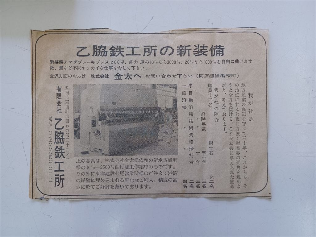2024.10.13(日) 晴れ 22.2℃ P0 U1.2 W65.05%22.1 115-65-60 休み 古い新聞広告 親戚で法事をすることになったが、自宅もお寺も元旦大地震で被災して使えない。 被災しながらもなんとか持ちこたえている、本家の仏間を使わせてもらうことになった。 本家では予期せぬ法事が突発し、慌てて仏間付近を片付けたものと思われるが、古い新聞の切り抜きが出て来たそうだ。 新聞の発行日はわからないが、大型プレスブレーキRG200の購入時期は分かっていて、1972年2月吉日、52年前だ。 そのころσ(^_^)は広島にいて、山陽新幹線の広島県内のトンネル工事が終息しかかっていた。 地方産業の底辺を守って三十年、これからもその地位に甘んじ、さらに力強く産業界の死角を埋めようと全力を傾ける。 これが私どもに与えられた使命だと考えております。 社是の文面は親父が常日頃唱えていた自説をまとめたものだろう。 「その地位に甘んじ」るところなど、らしさが現れている。 57歳にして親父の意気は軒昂だが、同じ57歳ごろのσ(^_^)は眠れなくて精神科に通っていたな。(^^;) このプレスは未だ活躍しているし、いささか範疇が広すぎて表現しにくい鉄工所の性格と方向を決定づける設備投資だった。 同業なら保有設備を見れば、何をやっている鉄工所かはおおむね想像が付く。 当時とは仕事の内容も販路も変わってしまっていて、社是は形として残しているわけではないが、やってることはたいして変わりはない。 この辺境でできることをしながら生きていくしかない。今も昔も。 |