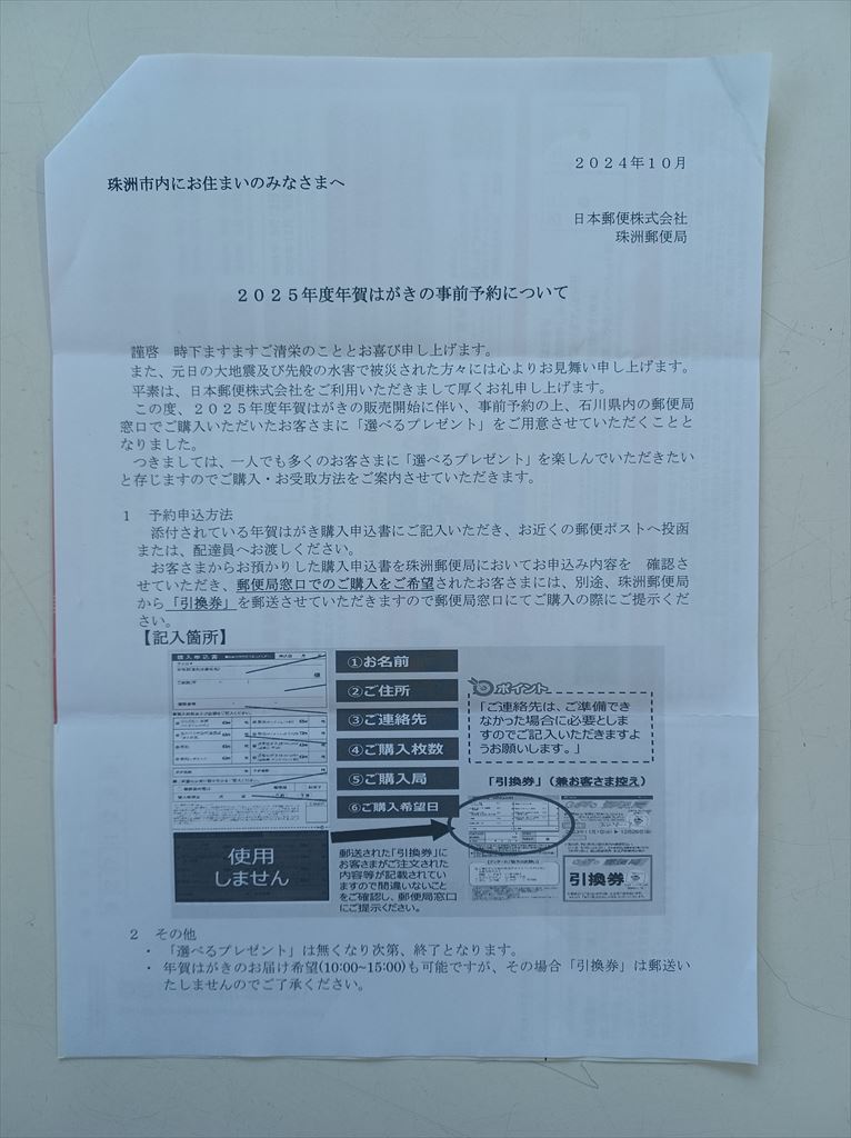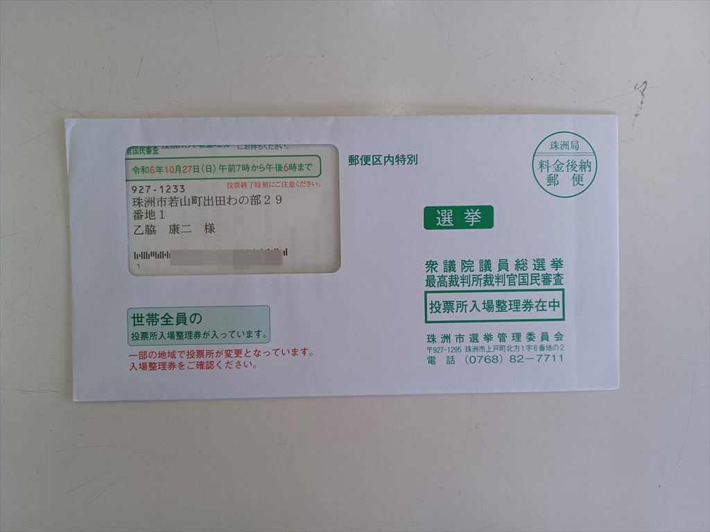 2024.10.17(木) 晴れ 22.3℃ P0 U1.1 W65.75%21.9 120-70-61 本日の滞留円筒 計9本(完成品2本 塗装済0+2本 錆止済1本 未塗装0+2本 半製品0+2本) 投票所入場整理券 衆院選は二日前、15日に公示されているが、いつもなら公示日に届くはずの投票所入場整理券が一向に届かない。 発送漏れしたんじゃないかとかなり心配したが、今日の午後に届いた。 考えてみれば、元旦大地震に続き、豪雨災害で住民は散り散りバラバラだ。 誰がどこに住んでいるのか、各集落の区長でも掴み切れていないだろう。 いつものように年賀状ソフトで一括印刷して、はい、終わり、とは行かない。 選挙管理委員会も苦労したと思うが、せっかくだけど米大統領選挙のほうがもっと気になっている。 |