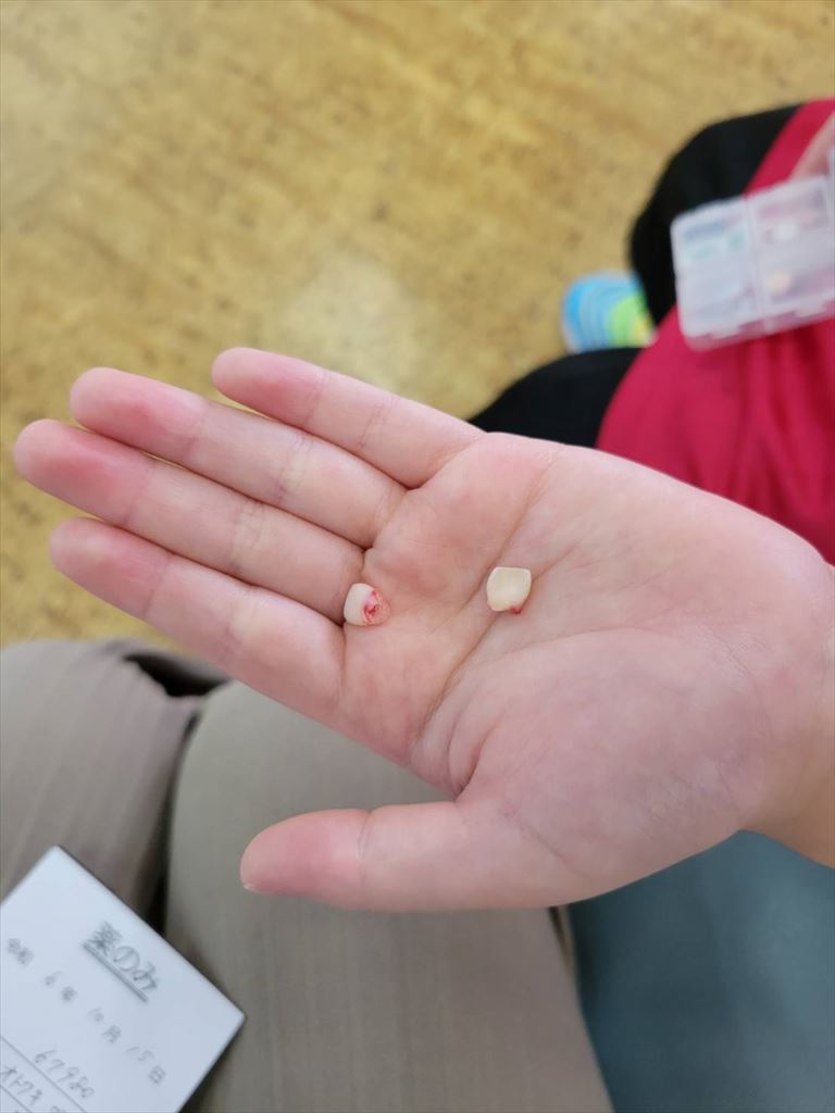 いくらグラグラの乳歯でも抜くのは怖い。 σ(^_^)など、ほんのちょいつながっているだけで外れ外れになっていても、独りでに取れてしまうまで誰にも触らせなかった覚えがある。 歯に血が付いているほどだから、抜いた時は痛みがあっただろう。 それを二本とも自分で抜いてしまうとは、いや~まったく尊敬するわ。(^^;) |