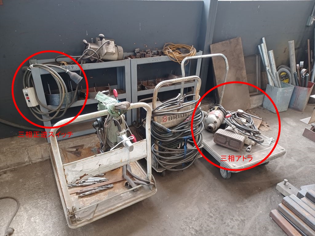 見つかった! 三相アトラが置いてあった場所のすぐ近くだった。 今も昔も青い鳥は身近なところにいるもんと話が決まっている。 人はなぜ遠くばかり探すのだろう。。。 せっかく見つかった三相正逆スイッチだが、三相アトラの出番は終わっていた。 逆相のコンセントを探して、逆回ししたそうだ。 |