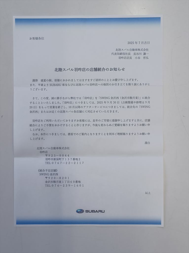 2025.07.17(水) 曇り一時ポツリポツリ 28.9℃ P0 U0.0 W64.50%20.7 99-57-58 本日の滞留円筒 計27本(完成品6+10本 塗装済0+0+4本 錆止済0+0+1本 未塗装0+0+2+1本 半製品0+0+0+3本) 羽咋スバル閉店 σ(^_^)のレイバックは八月の終わりにエンジンを乗せ換える大手術を受けることになっている。 段取りとしては、 @ 8月28日に金大病院へ行く用事があるので、羽咋スバルにレイバックを乗り捨て、代車で病院の用事を済ませる。 A エンジン載せ替えが終わるまで代車は借り続け、レイバックの退院に合わせて引き取りに行って乗り換える。 つもりだ。 折しもその羽咋スバル(正式には北陸スバル自動車(株)羽咋店)が九月いっぱいで営業を終了すると言う案内が届いた。 エンジン載せ替え直後の店仕舞いだ。 エンジンの無償交換の責任を取って詰め腹を切らされるみたいで、どうも寝覚めが悪い。 σ(^_^)のせいでも羽咋スバルのせいでもないんだが。。。 |