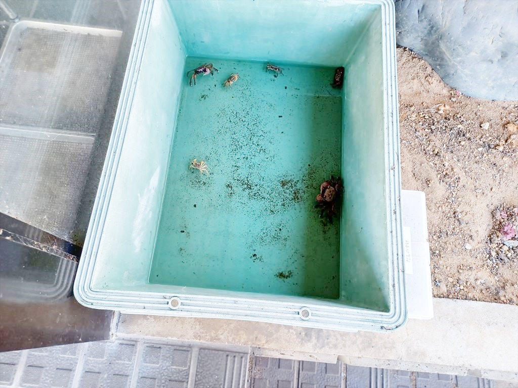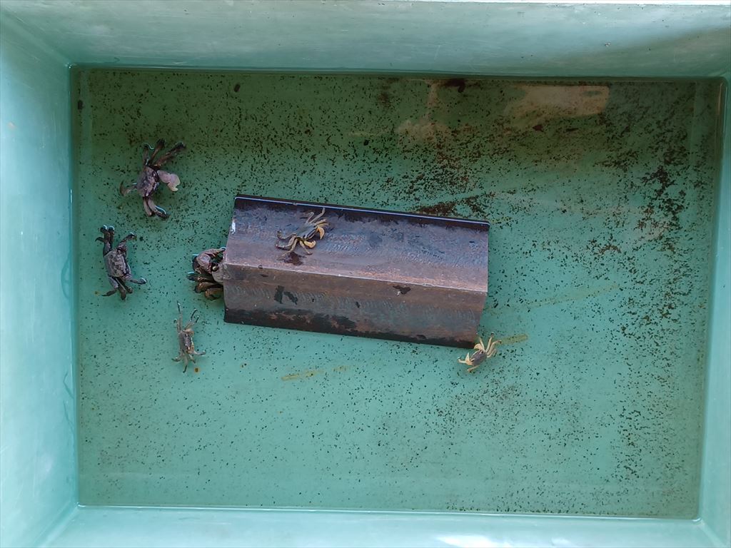 2025.07.24(木) 晴れ 33.9℃ P0 U3.0 W65.75%20.2 97-55-59 本日の滞留円筒 計25本(完成品3+10本 塗装済0+0+6本 錆止済0+0+1本 未塗装0+0+0+3本 半製品0+0+0+2本) 本日の出荷 秋田県大館市行き 10トン車4台 ベンケイガニ いつの間にか夏休みが始まって、付近の小学生が桜の駐車場に集まってラジオ体操をしているらしい。 子供たちは体操が終わってからもカニ取りに熱中してなかなか帰ろうとせず、付き添いの親たちを困らせているそうだ。 クロサンショウウオのシンダクに使っていた小さなトロ舟が復活している。 これらの小さなカニはベンケイガニの仲間だ。 本来はエラ呼吸のはずだが、陸上生活に適合して水がなくても生きていける。 しかし出るに出られない箱に入れられて、餌がなければ死んでしまうだろう。 その昔、無辜のベンケイガニを数限りなく殺してしまったσ(^_^)としては、もうカニが死ぬところを見たくないのだが。 |
