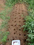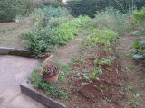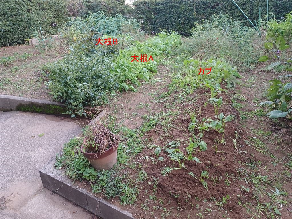 あれから一ヶ月。。。 穴の中に丁寧に埋めたカブの種は窒息死したのか発芽せず、ばらまいた種だけ盛大に芽を出した。 やたら芽を出したカブはそのまま放置も出来ず、芽が出なかったところに植え直した。 向うの方で茂っているのがバラ蒔いた種から出たカブ。 手前のしょぼくれているのが植え直したカブで、今はヘタレていても根付けばシャキッと起きる、とペンギンは断言している。 かたや大根は二種類とも、一つの穴に一本の芽が出ればいいところ、埋めた種の数だけ律義に発芽した。 根菜なので、そのままでは太れない。 ほとんどの芽を間引きする羽目になった。 |