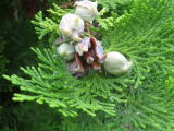 種の大きさは長径で6oぐらいあって.、皮は歯が立たないくらい固い。 地上に落ちた種を、間違って小鳥が飲み込むにはちょっと大きすぎで、熊には小さすぎだ。 小鳥ならヒヨドリ大の体格が必要だが、 残念ながらヒヨドリは種ではなく果実を食べる鳥だし、イソヒヨドリは肉食だ。 その辺にたくさんいるスズメが口に入れるのはとても無理で、ごくたまに訪れるヤマガラならギリ、行けるかも。 しかしアホなスズメならともかく、芸を覚えるほど利口なヤマガラは、こんな皮の固い実を最初から口に入れないだろう。 とすると、この種は元の木から枝先までの距離だけ離れて落ちて、芽を吹くことになる。 一気に世界制覇を狙わず、確実に半歩ずつ版図を広げるのがコノテガシワの戦略らしい。 あるいは、せめて世代交代だけでもできれば良しとする、ささやかな望みか。 |