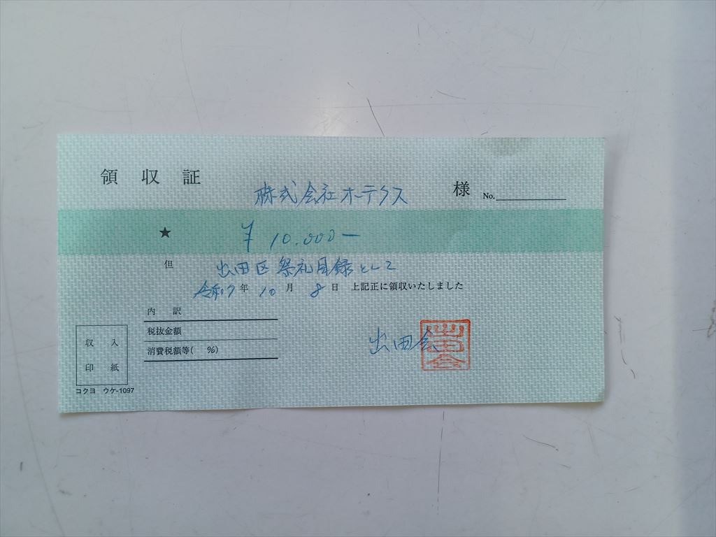祭りのキリコは巡行してきて、寄付金を集金して行ったそうだ。 個人でも秋祭りは一軒当たり三千円の負担金が徴収されるから、企業としての負担は特別多いわけではない。 寄付は任意なのでもちろん拒否することも出来る。 これも出田区に引っ越しして以来だから半世紀は続いている、応分の負担と言えよう。 たとえ氏子会から抜けても、会社がある限りは継続するのではなかろうか。 領収書の但し書きに「出田区祭礼目録」とあるが、目録とは珠洲市一円では寄付金のこと。 出田会は氏子会とは別の組織で、氏子の青壮年部みたいな位置づけで、神輿にには関わらずキリコの運行を担当している。 ただし少子高齢化のため、60歳代なら立派な青壮年部だ。 |