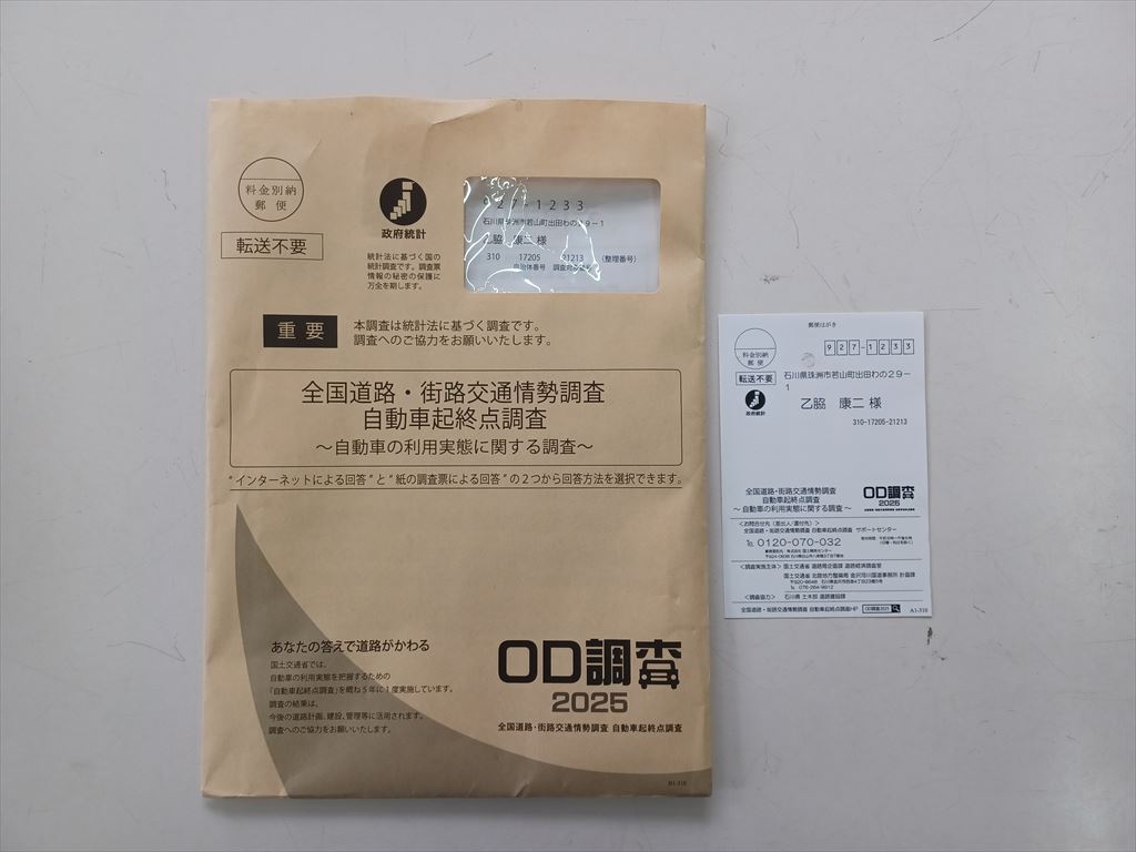 2025.10.10(金) 曇り 22.6℃ P0 U0.0 W65.35%22.9 122-73-54 本日の滞留円筒 計22本(完成品13本 塗装済0+7本 錆止済0+0本 未塗装0+0本 半製品0+0+2本) OD調査2025 半月ほど前だったかな、OD調査のお願い と称する葉書が国土交通省道路局から送られて来た。 この葉書が前振りで、後日、調査資料が届いた。 OD調査とは「全国道路・街路交通情勢調査 自動車起終点調査」と言うおっそろしく長い名前をかっつめたもんだそうだ。 どうやったらアルファベット二文字に端折れる? |