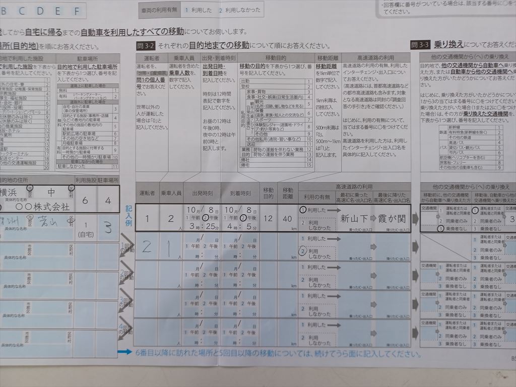 設問が微に入り細を穿ち過ぎる。 行く先々の住所、発着時間、走行距離などがわかる、ドライブレコーダみたいな人がこの世にいようか。 こんなん、国土交通省の役人以外の誰がまじめに答えるものか、と放り投げた。 |
