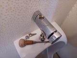 止水弁だけはわかるので、付属の専用工具で水を止めようとしたが、固くてとても回せない。 ステンレス板から切り出しただけの簡単な専用工具のほうがねじれてしまいそうだ。 |