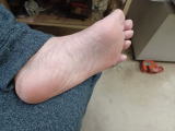 ウオノメ終了 風呂上がり、耐久テスト終了後に足の裏に貼ったバンドエイドが半分浮いていたので、剥がすことにした。 左の足の裏にはもうウオノメの形跡もない。 微かに変色しているのは、おそらくバンドエイドを長期間貼り続けたせいだろう。 |