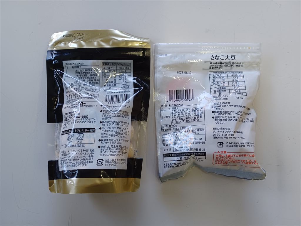 味は・・・まあ、きなこ大豆だ。 好みにもよるだろうが、食べ慣れたバローに軍配が上がる。 粒の大きさはゲンキーがだいぶ小さいが、これは問題なし。 値段はバローが130gで298円なのに対し、ゲンキーは90gで199円だからいい勝負だろう。 三ヶ月に一度の金大病院通いで、バローに行けなかったときのバックアップとして、ゲンキーのきなこ大豆は貴重だ。 |