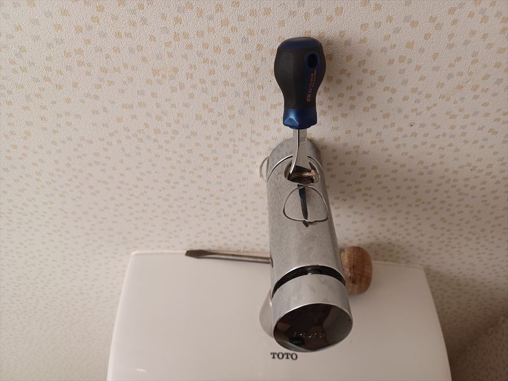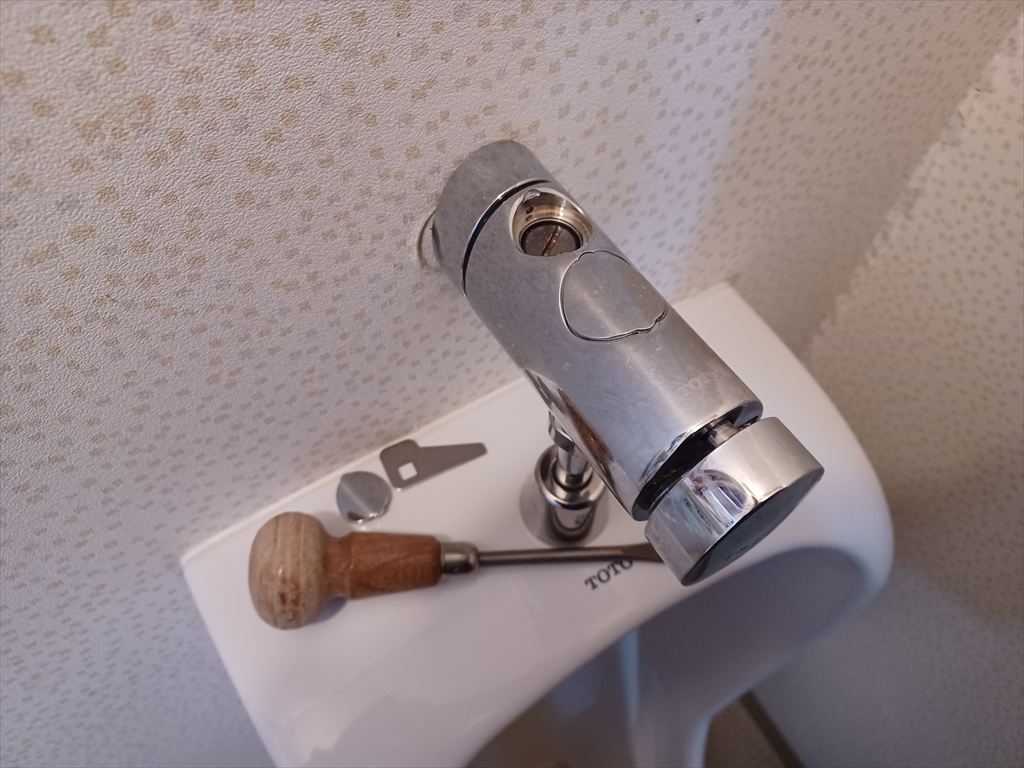 手持ちにある一番幅広のマイナスドライバーを使ってみた。 何とか締められる。 どうせσ(^_^)しか使わないので、一回一回ドライバーで開け閉めすることにした。 しかしもっと幅の広いドライバーでないと、夜中に半分寝ぼけて開け閉めしていると、止水弁の溝を壊しそうなんだが。。。 |