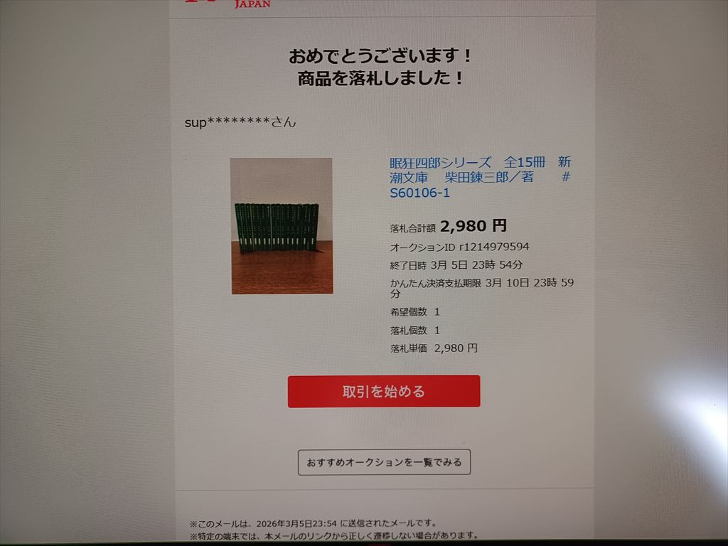 2026.03.06(金) 曇り 6.6℃ P0 U1.1 W66.95%23.4 119-65-57 本日の滞留円筒 計31本(完成品0+13本 塗装済14+0本 錆止済0+0本 未塗装0+0+1本 半製品0+0+3本) かんたん決済 高専の寮で五年間同じ釜の飯を食った同級生が、今頃になって眠狂四郎を読みたくなったそうだ。 あちこち書店を漁って見たが見つからなかったらしい。 あったりまえだ。今ごろ柴錬(柴田錬三郎)の本が新刊書の棚に並んでいるわけない。 とはいえ、寮で眠狂四郎を回し読みした仲ではあるので、ここは一肌脱ぐことにした。 とりあえずは初期の作品、「無頼控」全六巻があればいいだろう、とヤフオクを物色したが、やっぱり出品数が少ない。 ほかのシリーズも合わせて全15冊セットをやっと見つけた。 店晒しが長いみたいだし、競争相手など誰もいるわけないから落札は確実だが、一抹不安があって二の足を踏んだ。 入札は以前と変わらず簡単だが、支払いの「かんたん決済」で、すんなりクレジットカードが使えるだろうか。 元旦大地震を境にヤフオクから足を洗ってもはや二年以上経っている。 その間、クレジットカードの認証方式はずいぶん変わっている。 ヘタすると落札したあと決済できず、「非常に悪い」の評価が付いてしまうかも知れない。 競争相手がいなければほぼ即決と同じようなもんで、朝起きると当然ながら落札していた。 賽は投げられた。進むしかない。 |