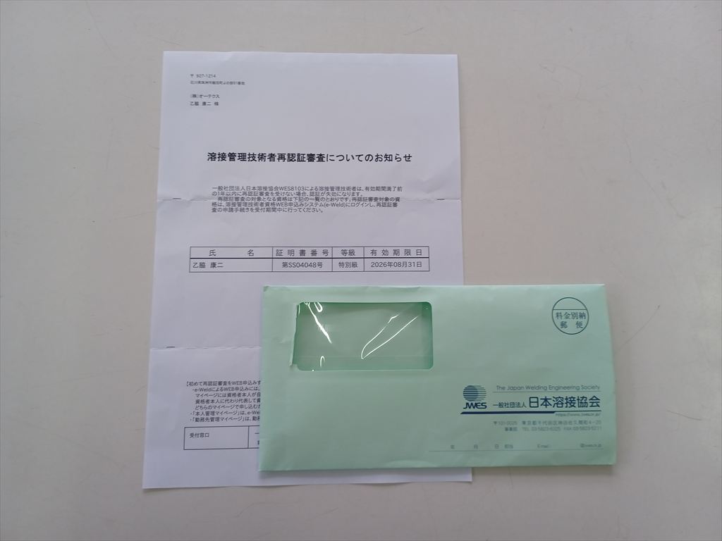 2026.03.09(月) 曇り一時雨 6.8℃ P0 U1.1 W67.05%23.6 132-69-59 本日の滞留円筒 計31本(完成品0+13本 塗装済14+0本 錆止済0+0本 未塗装0+0+2本 半製品0+0+2本) 念押し 日本溶接協会から見覚えのある封書が届いた。 開けてみると溶接技術者資格の更新試験のお知らせで、これが最後の機会になるとの念押しだ。 うっかり忘れてあたら貴重な資格が失効しないように、親切で知らせてくれているのはわかるが、今となっては有難迷惑。 半年前にやっと踏ん切りをつけて、やっと明鏡止水の心境になっていたのに、またぞろ波風を立てられたような気分だ。(-_-#) |
