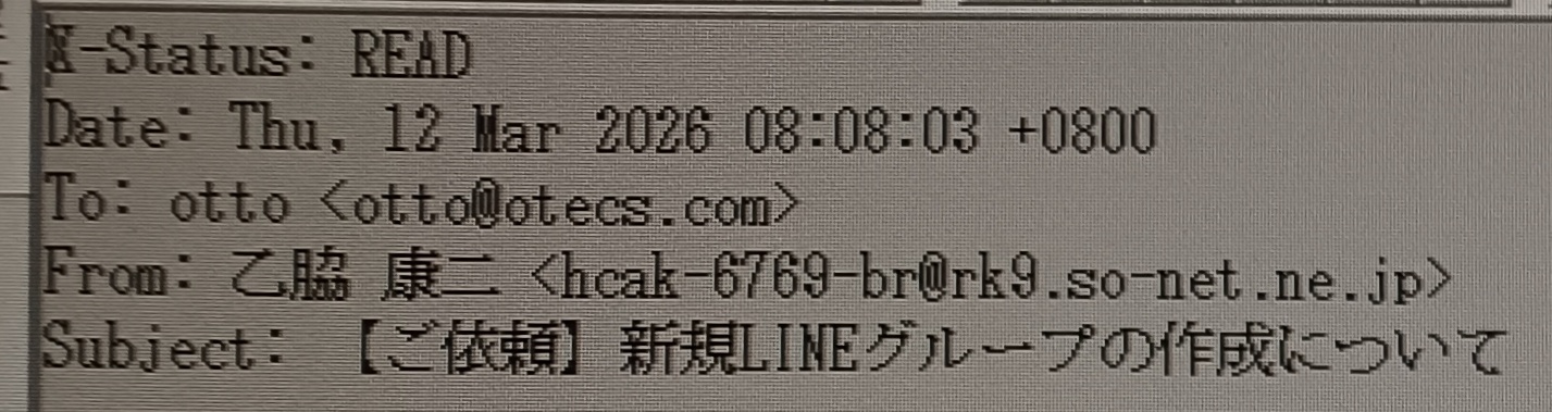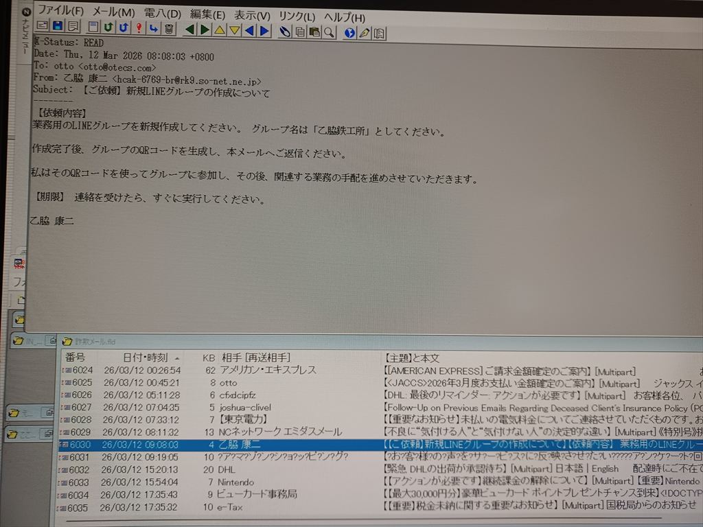 2026.03.12(木) 晴れ時々曇り 7.4℃ P0 U1.1 W66.15%24.1 106-63-65 本日の滞留円筒 計27本(完成品14+7本 塗装済0+0+1本 錆止済0+0+1本 未塗装0+0+2本 半製品0+0+2本) 本日の出荷 北海道泊村行き トレーラ 1台 詐欺メール 近頃詐欺メールの数が減った。 一世を風靡した愚にもつかないAmazonネタは、どなたか取り締まっていらっしゃるのか、激減した。 Googleが電信八号を遮断したこととも関係あるのかなぁ。。。 それでもなお、日に10通や20通の詐欺メールは届くが、その中にめずらしいものが混じっていた。 差出人も宛先も自分のメールアドレスのユーザー名になっている詐欺メールは珍しくない。 しかし、差出人名が漢字のフルネームの詐欺メールは初めてだ。 本文は文章が日本語になっておらず、大陸系だと思われる。 ネットで拾ったのだろうが、会社名まで漢字で入っているし、本邦初の栄誉を与えてもいいだろう。 差出人のメールアドレスは身に覚えはないが、本文の文面からするとどこかに実在して、返信メールは詐欺師に届くらしい。 せっかくのお誘いではありますが、スマホの話でσ(^_^)にはよくわかりません。 ご要望には応じられませんので、あしからず。 |